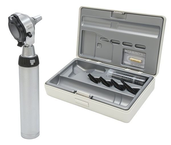 BETA 400 F.O. Otoskopas XHL, 1 rinkinys (4 vnt.) daugkartinio naudojimo antgalių (B-000.11.111), 10 vienkartinių AllSpec antgalių 4 mm Ø, atsarginė lemputė XHL versijai, kietas dėklas, BETA4 USB įkraunama rankena su USB laidu ir įjungiamu maitinimo šaltiniu.