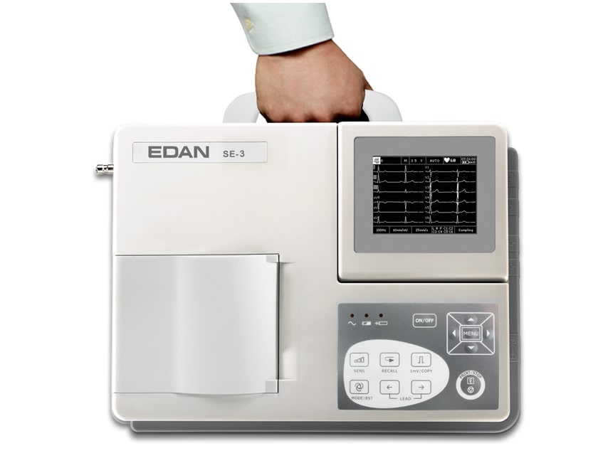 Trijų kanalų Edan SE-3 elektrokardiografas su diagnoze siūlo geriausią kokybę, našumą ir kainą. Jis pasižymi pažangiomis funkcijomis, ergonomišku dizainu ir tvirta konstrukcija. Jame yra didelis LCD ekranas, kurio skiriamoji geba yra 320 x 240 pikselių, ir didelės skiriamosios gebos 80 mm pločio terminis spausdintuvas, skirtas EKG bangos formai rodyti su automatiniu išlygiavimu ir spausdinamų simbolių bei bangos formos išlygiavimo funkcija. Grafinius parametrus vartotojas gali reguliuoti pagal savo poreikius.