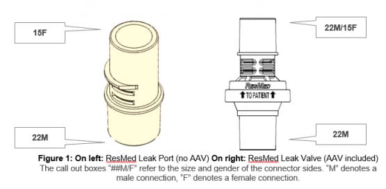 ResMed nuotėkio vožtuvas yra vienkartinio naudojimo nuotėkio anga (nuo 1 iki 7 dienų), kurioje įmontuotas anti-asfiksijos vožtuvas (AAV), leidžiantis nuolatiniam oro srautui per ventiliacijos angas. Netikėto ventiliatoriaus gedimo atveju anti-asfiksijos vožtuvas atsidaro į orą, užkertant kelią iškvėpto anglies dioksido pakartotiniam įkvėpimui.