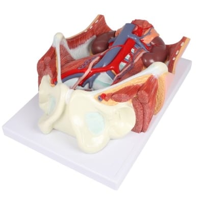 Šis anatominis modelis suteikia išsamų žvilgsnį į šlapimo sistemą, kartu su aplinkinėmis struktūromis tiek vyriškoje, tiek moteriškoje anatomijoje.